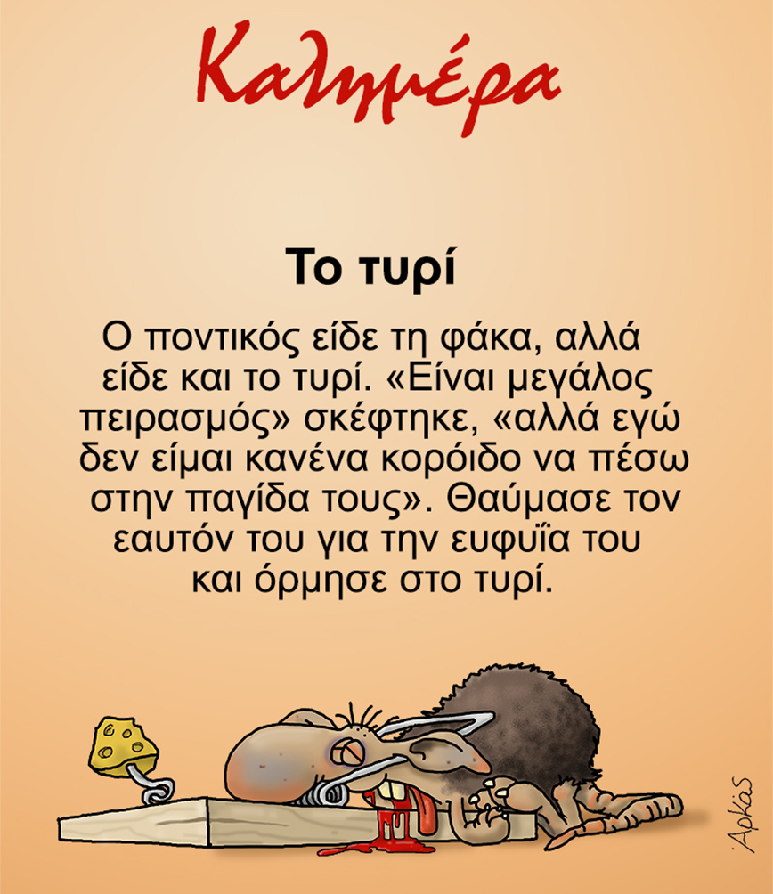 «Καλημέρα. Ο ποντικός είδε τη φάκα, αλλά είδε και το τυρί. ”Είναι μεγάλος πειρασμός” σκέφτηκε, ”αλλά εγώ δεν είμαι κανένα κορόιδο να πέσω στην παγίδα τους». Θαύμασε τον εαυτόν του για την ευφυΐα του και όρμησε στο τυρί» αναφέρει ο Αρκάς.