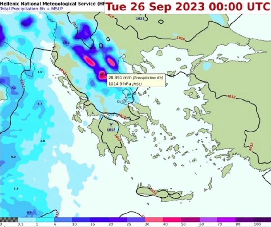 -Την Τρίτη (26-09-2023) στο Ιόνιο και τα ηπειρωτικά (πλην της ανατολικής Μακεδονίας και Θράκης) προβλέπονται νεφώσεις με τοπικές βροχές και τοπικά ισχυρές καταιγίδες. Στη Θεσσαλία τα μεγαλύτερα ύψη βροχής θα σημειωθούν κυρίως στα βόρεια και ανατολικά τμήματα του νομού Μαγνησίας, καθώς επίσης και στους νομούς Καρδίτσας, Τρικάλων και τις νότιες περιοχές του νομού Λάρισας.
