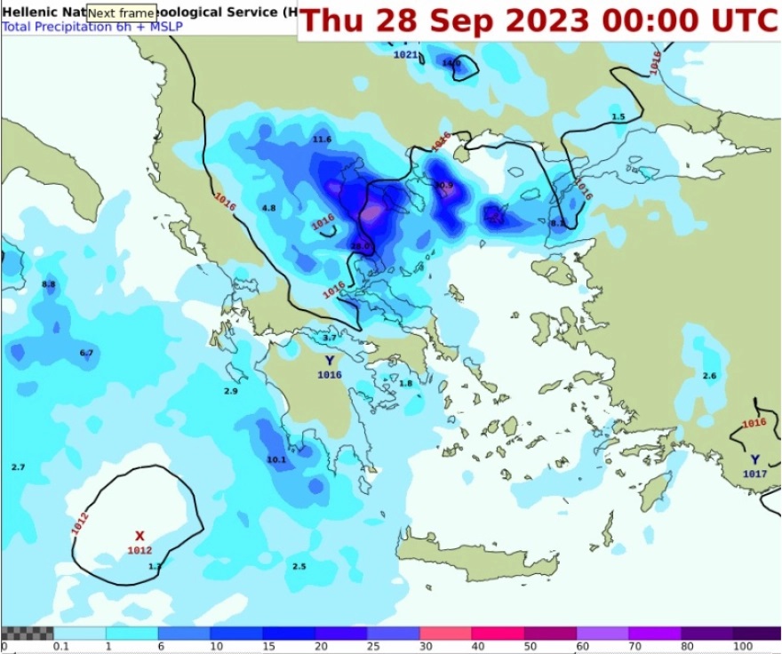 -Την Τετάρτη (27-09-2023) σε όλη σχεδόν τη χώρα προβλέπονται βροχές ενώ καταιγίδες τοπικά ισχυρές θα εκδηλωθούν στο Ιόνιο, την ηπειρωτική χώρα, την Εύβοια και το βόρειο Αιγαίο. Επισημαίνεται ότι στη Θεσσαλία τα μεγαλύτερα ύψη βροχής θα εκδηλωθούν στο νομό Καρδίτσας, Λάρισας και Τρικάλων καθώς επίσης και στα ανατολικά τμήματα της Μαγνησίας. Ισχυρές καταιγίδες θα εκδηλωθούν επίσης και στην περιοχή των Σποράδων.