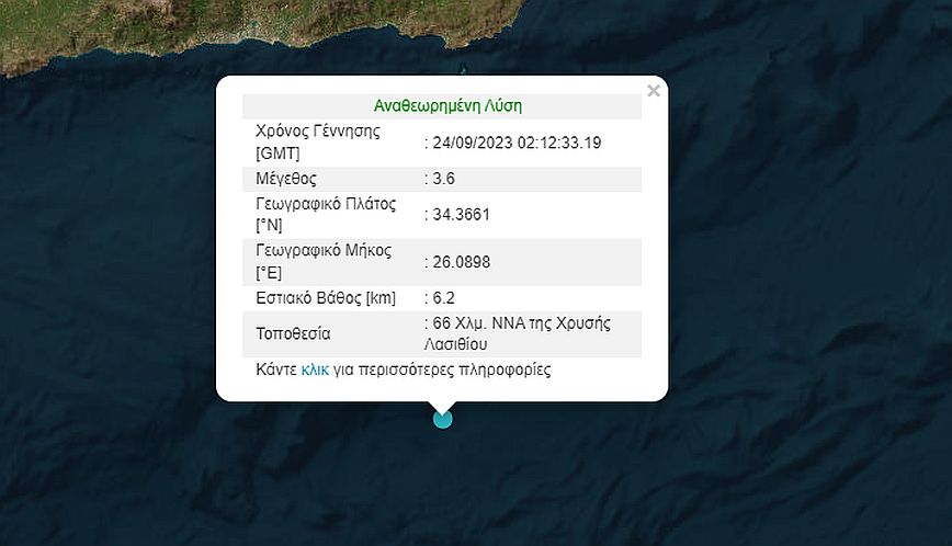 Το επίκεντρο του σεισμού εντοπίζεται 66 χιλιόμετρα νότια-νατιοανατολικά της Χρυσής Λασιθίου και είχε εστιακό βάθος στα 6,2 χιλιόμετρα.