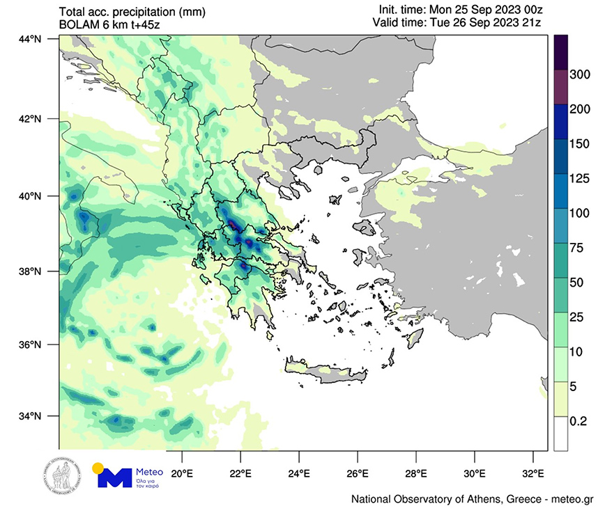 Στον προγνωστικό χάρτη που ακολουθεί απεικονίζεται η εκτιμώμενη γεωγραφική κατανομή των αθροιστικών βροχοπτώσεων (σε χιλιοστά) μέχρι και το πέρας της Τρίτης 26/09. Με βαθύτερες αποχρώσεις αποτυπώνονται τα μεγαλύτερα ύψη βροχόπτωσης.