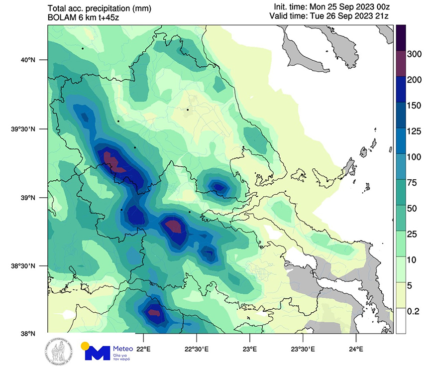 Ειδικότερα για τη Θεσσαλία, όπως φαίνεται στον προγνωστικό χάρτη που εστιάζει στην ευρύτερη περιοχή, τα μεγαλύτερα ύψη βροχόπτωσης (σε χιλιοστά) μέχρι και το πέρας της Τρίτης 26/09, αναμένονται στις περιοχές του Πηλίου και της Όθρυος, καθώς και στα δυτικά τμήματα της περιφέρειας.