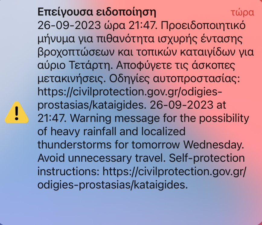 Το μήνυμα αναφέρει: «Προειδοποιητικό μήνυμα για επικίνδυνα καιρικά φαινόμενα (ισχυρές καταιγίδες, χαλαζοπτώσεις) για το επόμενο 24ωρο. Περιορίστε τις μετακινήσεις κατά τη διάρκεια των φαινομένων & ακολουθείτε τις οδηγίες των Αρχών».