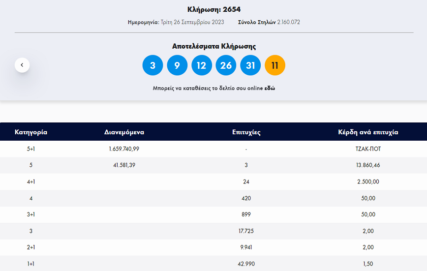 Οι τυχεροί αριθμοί λοιπόν, στη σημερινή κλήρωση Τζόκερ είναι οι εξής: 3, 9, 12, 26, 31 και Τζόκερ ο αριθμός: 11.