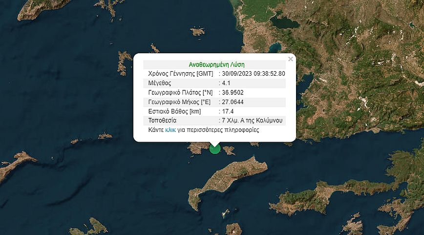 Σεισμική δόνηση μεγέθους 4,1 βαθμών της κλίμακας Ρίχτερ σημειώθηκε το πρωί του Σαββάτου ανοιχτά της Καλύμνου, σύμφωνα με το Γεωδυναμικό Ινστιτούτο του Εθνικού Αστεροσκοπείου Αθηνών.