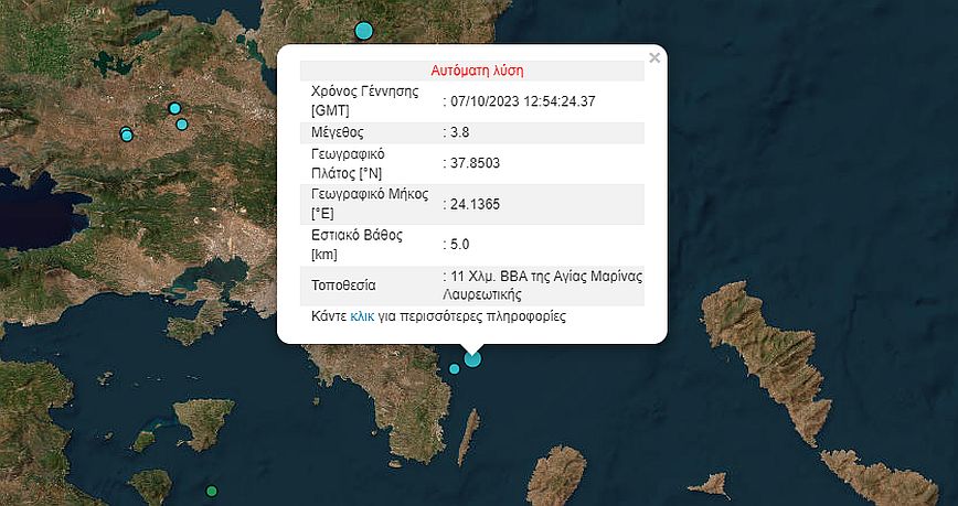 Σεισμική δόνηση μεγέθους 3,8 βαθμών της κλίμακας Ρίχτερ σημειώθηκε πριν από λίγο στη Λαυρεωτική, σύμφωνα με το Γεωδυναμικό Ινστιτούτο του Εθνικού Αστεροσκοπείου Αθηνών, κι έγινε αισθητός στην Αττική.