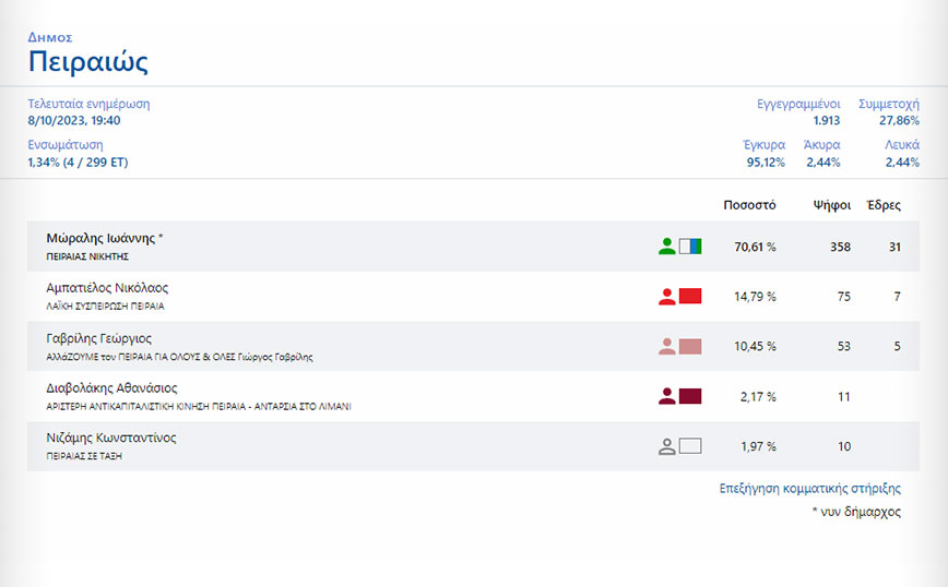 Στα πρώτα επίσημα αποτελέσματα από τον δήμο Πειραιά, στα πρώτα 4 εκλογικά τμήματα ο Γιάννης Μώραλης εμφανίζεται με 70,61 % ο νυν δήμαρχος, Γιάννης Μώραλης.