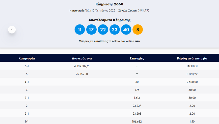 Απόψε Τρίτη 10 Οκτωβρίου 2023, στην κλήρωση 2660 του Τζόκερ του ΟΠΑΠ, θα μοιραστούν στους τυχερούς της πρώτης κατηγορίας τουλάχιστον 4.300.000 ευρώ.