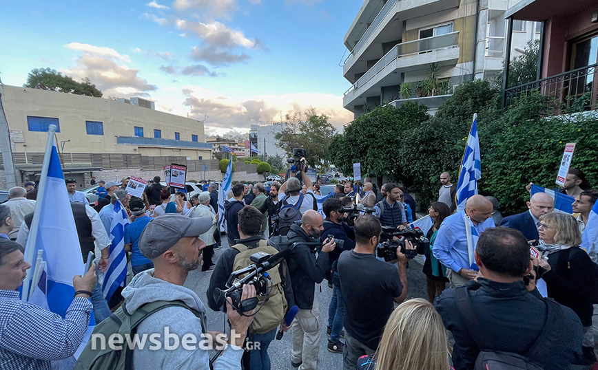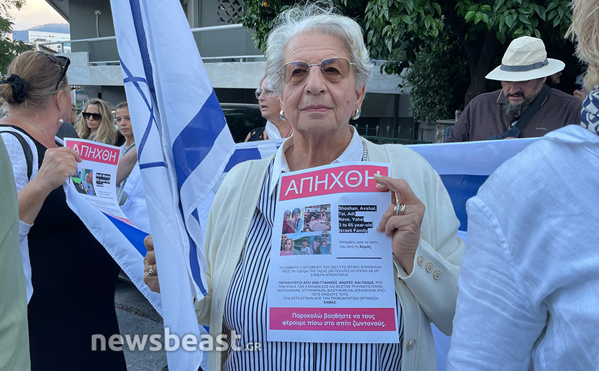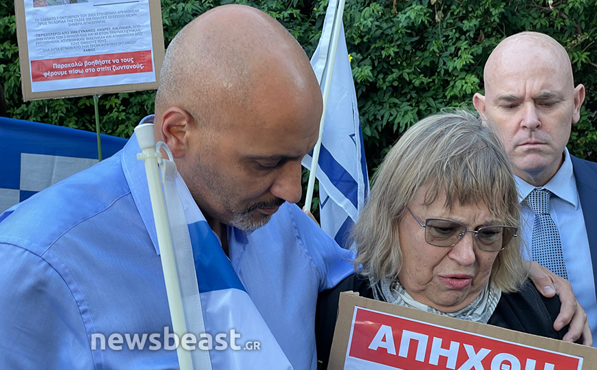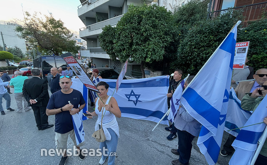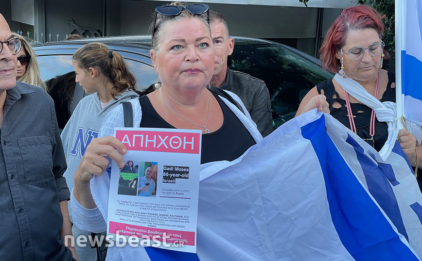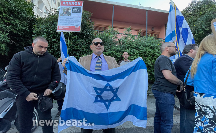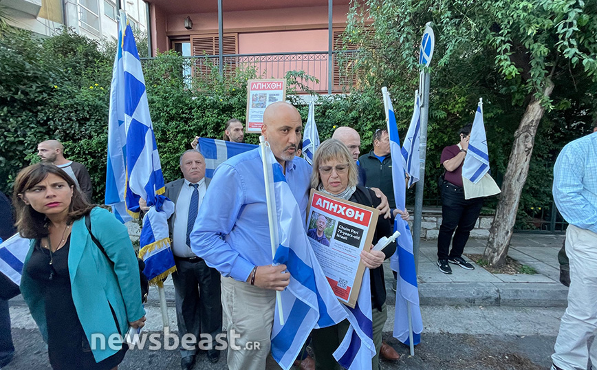 Οι συγκεντρωμένοι κρατούσαν σημαίες του Ισραήλ και της Ελλάδας, ενώ είχαν φωτογραφίες στα χέρια τους με κόσμο που εικάζεται ότι έχει απαγάγει η Χαμάς και κρατάει ως ομήρους.