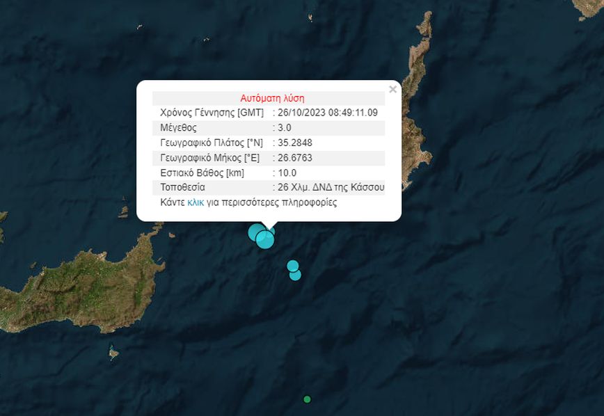 Ο πρώτος σεισμός κατεγράφη στις 10:18 ώρα Ελλάδος, με το επίκεντρο της δόνησης να εντοπίζεται στο θαλάσσιο χώρο 28 χλμ. δυτικά νοτιοδυτικά της Κάσσου.