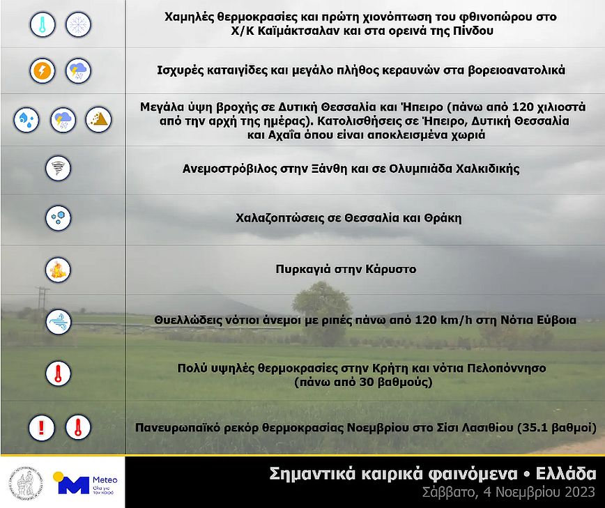 Εντυπωσιακά σκαμπανεβάσματα του καιρού στην Ελλάδα το Σάββατο 4 Νοεμβρίου καθώς από τη μια είχαμε πανευρωπαϊκό ρεκόρ ζέστης στην Κρήτη με 35 βαθμούς και από την άλλη χιόνια και καταιγίδες στα ηπειρωτικά.