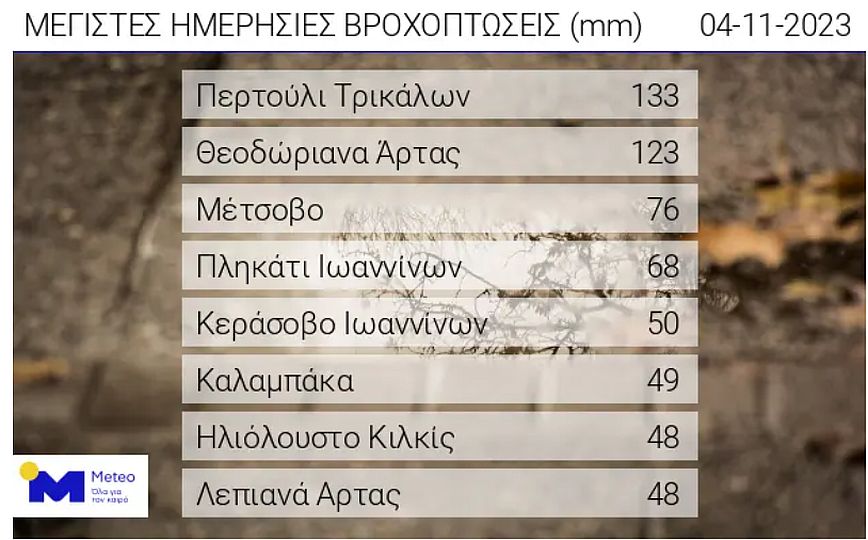 Τέλος, στον παρακάτω πίνακα παρουσιάζονται τα 8 μεγαλύτερα ημερήσια ύψη βροχόπτωσης έως τις 16:00 το απόγευμα.
