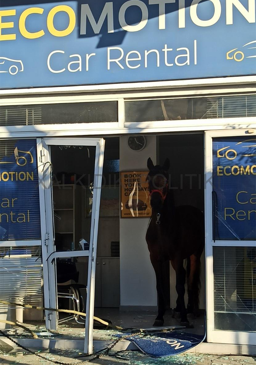 Τον πανικό σκόρπισε ένα άλογο στη Νικήτη Χαλκιδικής το οποίο εισέβαλε αφηνιασμένο σε κατάστημα ενοικιαζόμενων αυτοκινήτων και τα έκανε γυαλιά καρφιά.
