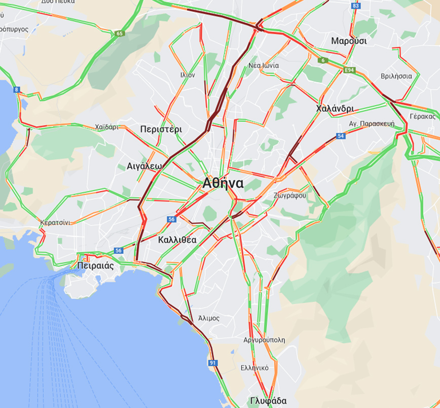 Ο χάρτης με τους δρόμους λίγο μετά τις 09:00 το πρωί