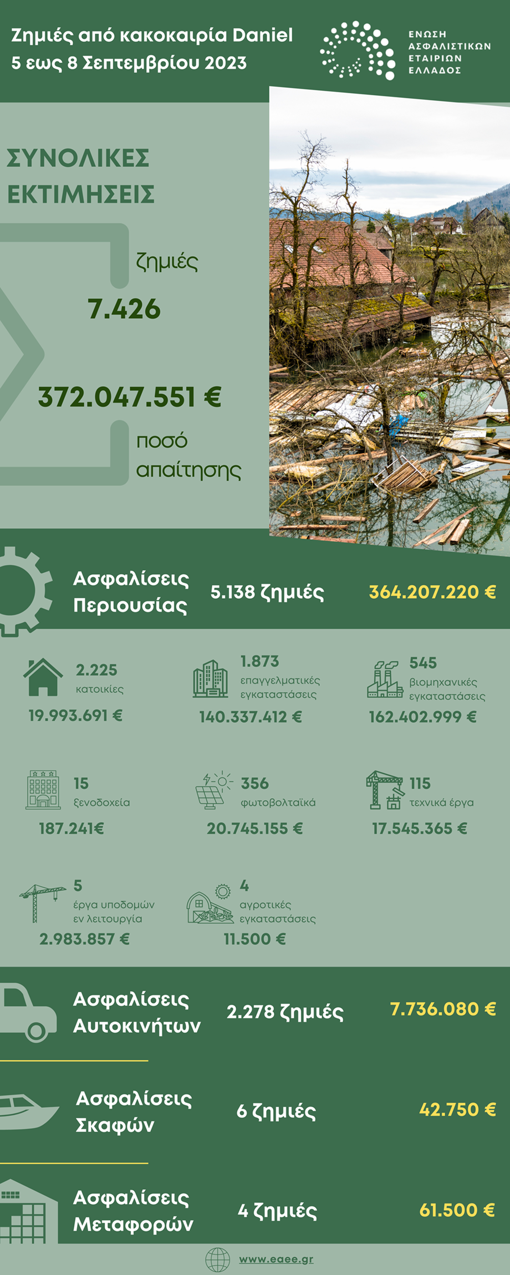 Ο Πρόεδρος της ΕΑΕΕ, Αλέξανδρος Σαρρηγεωργίου δήλωσε σχετικά: «Οι ασφαλιστικές επιχειρήσεις ανταποκρίθηκαν άμεσα στις μεγάλες καταστροφές που προκάλεσε η κακοκαιρία Daniel, εκπληρώνοντας με υπευθυνότητα την αποστολή τους. Ήδη έχουν ολοκληρωθεί οι διαδικασίες για την αποτίμηση των ζημιών κι έχουν πληρωθεί αποζημιώσεις για ένα σημαντικό μέρος των ζημιών που έχουν υποστεί οι ασφαλισμένοι μας ενώ παράλληλα προχωρούν οι καταβολές για τις υπόλοιπες περιπτώσεις.
