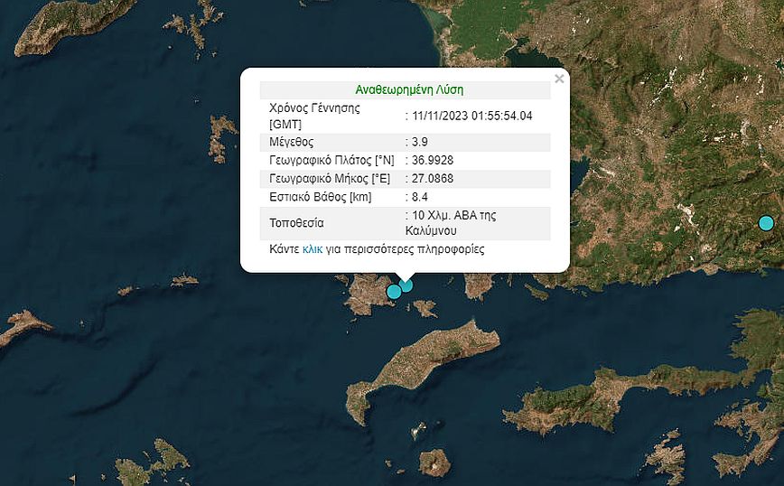 Σεισμική δόνηση μεγέθους 3,9 βαθμών της κλίμακας Ρίχτερ σημειώθηκε τα ξημερώματα του Σαββάτου στην Κάλυμνο, σύμφωνα με το Γεωδυναμικό Ινστιτούτο του Εθνικού Αστεροσκοπείου Αθηνών.