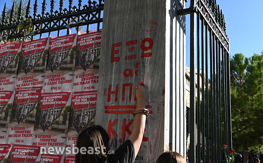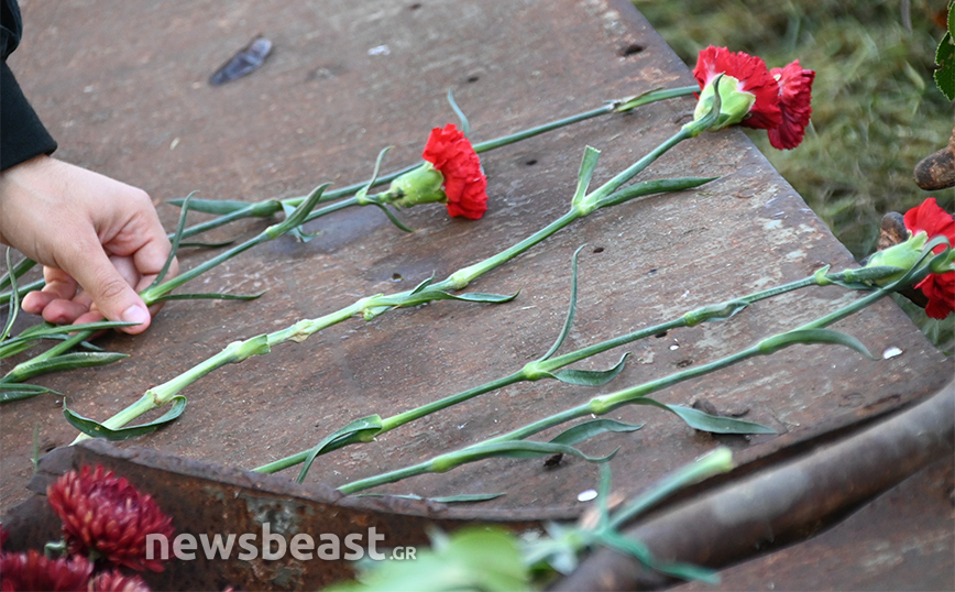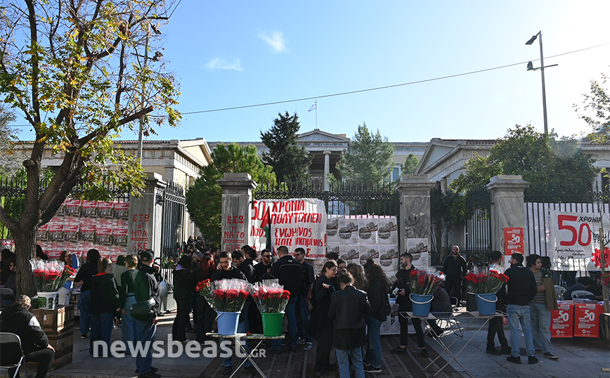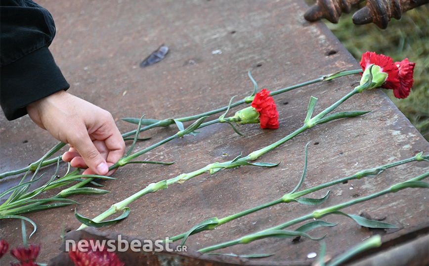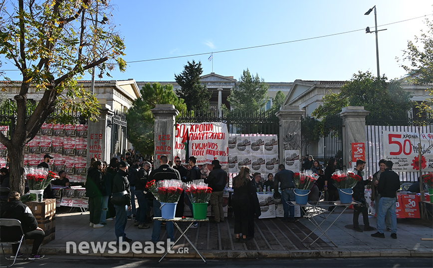 Ήδη φοιτητές και φοιτήτριες από σχολές της Αττικής βρίσκονται στον χώρο ενώ επισκέπτες αφήνουν ένα λουλούδι στο μνημείο.