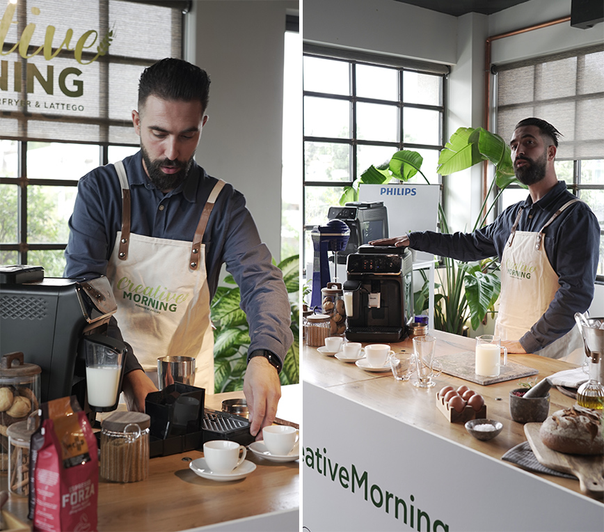 Την αρχή έκανε ο παγκοσμίως βραβευμένος Barista και Master του Latte Art, Μιχάλης Καραγιάννης, ο οποίος παρουσίασε τις εντυπωσιακές δυνατότητες της νέας αυτόματης μηχανής espresso LatteGo Series 2300 της Philips. Με ενθουσιασμό και επιδεξιότητα, δημιούργησε εκπληκτικούς καφέδες και μοιράστηκε μαζί μας τα μυστικά της τεχνολογίας SilentBrew για αθόρυβη άλεση και πιο γρήγορα καθοριζόμενο σύστημα γάλακτος, ώστε να μπορούμε να απολαμβάνουμε καθημερινά από το σπίτι μας απίστευτης ποιότητας καφέ.