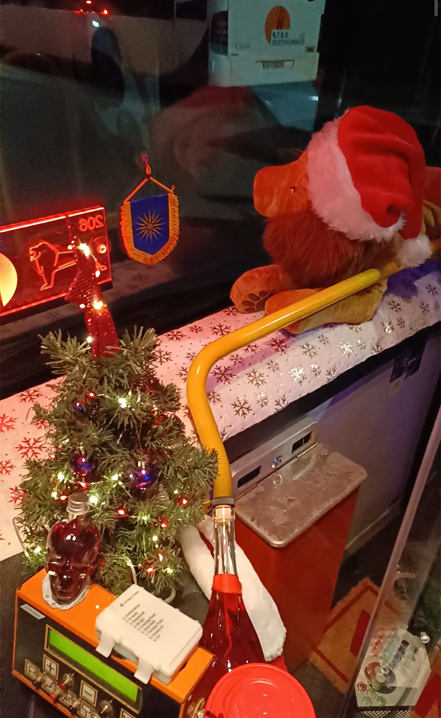 «Στην μπροστινή πόρτα του λεωφορείου υπάρχει δεντράκι με λαμπάκια, το ταμπλό είναι καλυμμένο με χριστουγεννιάτικο χνουδωτό ύφασμα, όπως επίσης και ένα λιοντάρι που φοράει λούτρινο σκούφο. Στην οροφή του οχήματος είναι κρεμασμένες γιρλάντες και μπότες, στις κολόνες έχουν τοποθετηθεί πιο μικρά δέντρα με φώτα. Μικρές πινελιές που συμβολίζουν κάτι μεγάλο» λέει ο κ. Κατσικάς, συμπληρώνοντας: «Αν έχει κάποιος έμπνευση και θέληση πετυχαίνει».