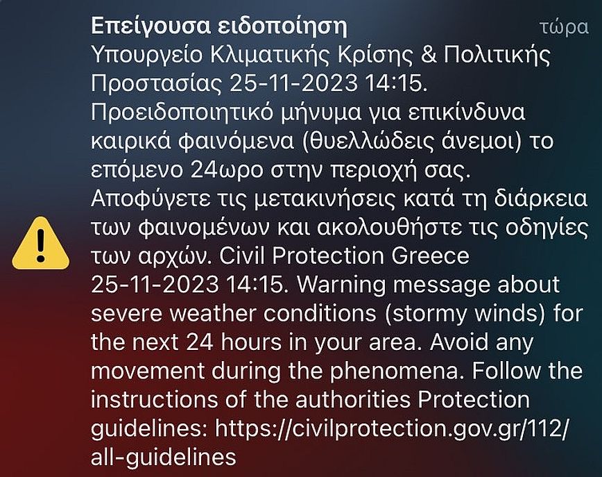 «Προειδοποιητικό μήνυμα για επικίνδυνα καιρικά φαινόμενα (θυελλώδεις άνεμοι) το επόμενο 24ωρο στην περιοχή σας. Αποφύγετε τις μετακινήσεις κατά τη διάρκεια των φαινομένων και ακολουθήστε τις οδηγίες των αρχών», έγραφε το σχετικό μήνυμα που έλαβαν οι Θεσσαλονικείς, ενώ λίγη ώρα αργότερα το ίδιο έγινε τόσο στους Πατρινούς όσο και στους Ξανθιώτες.