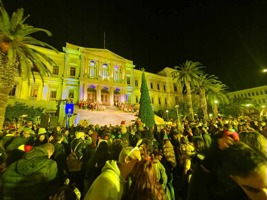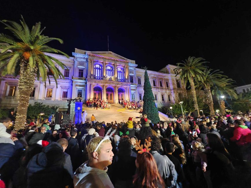 Η φωταγώγηση του χριστουγεννιάτικου δέντρου στην Πλατεία Μιαούλη της Ερμούπολης το απόγευμα της Δευτέρας 27 Νοεμβρίου, σηματοδότησε την επίσημη έναρξη των φετινών εορταστικών εκδηλώσεων του Δήμου Σύρου – Ερμούπολης.