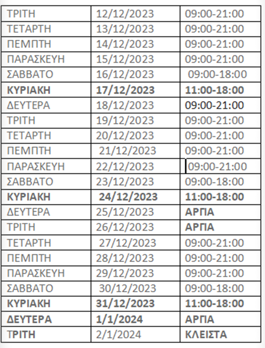 ΚΥΡΙΑΚΗ 24/12: 11.00 π.μ. – 6.00 μ.μ.