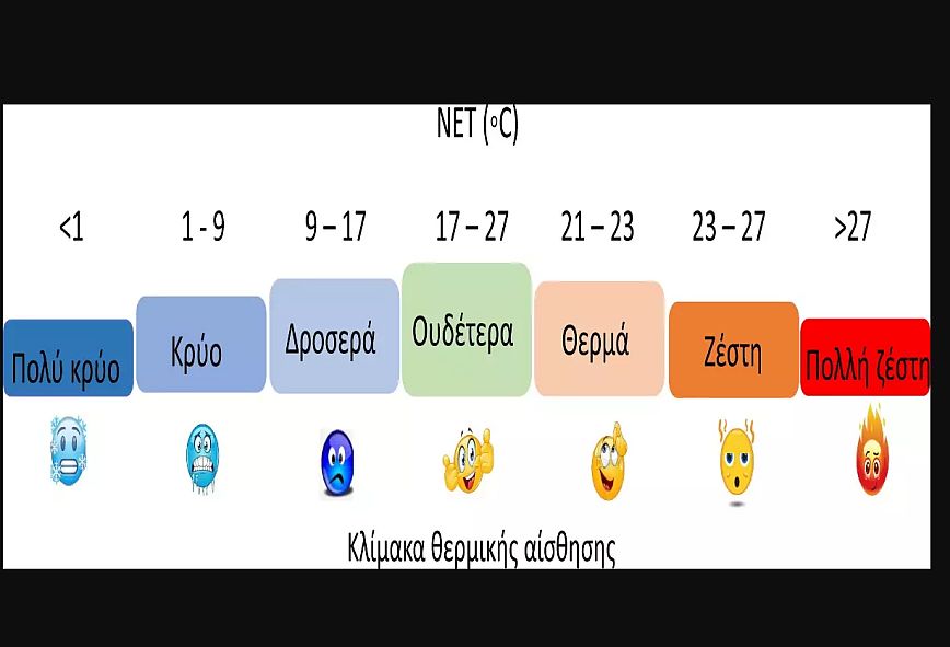 Για την εκτίμηση της αισθητής θερμοκρασίας και της θερμικής αίσθησης στην οποία αυτή αντιστοιχεί χρησιμοποιήθηκε ο θερμικός δείκτης ΝΕΤ (Νet Effective Temperature, °C). Ο ΝΕΤ υπολογίζεται λαμβάνοντας υπόψη τη θερμοκρασία του αέρα, την υγρασία και την ταχύτητα του ανέμου και εκφράζει τη θερμική αίσθηση βάσει κλίμακας επτά κατηγοριών.