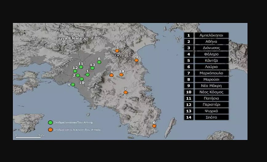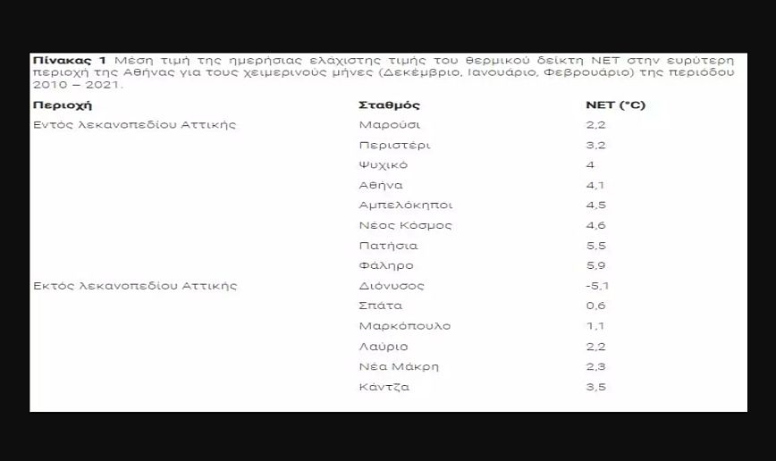 -Στις περιοχές εκτός του λεκανοπεδίου Αττικής η αισθητή θερμοκρασία ήταν χαμηλότερη σε σύγκριση με τις περιοχές εντός του λεκανοπεδίου. Πιο συγκεκριμένα, η μέση ημερήσια ελάχιστη τιμή του δείκτη ΝΕΤ υπολογίστηκε 0,8◦C εκτός και 4,3◦C εντός του λεκανοπεδίου.