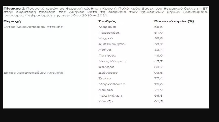 -Σε όλες τις περιοχές εντός του λεκανοπεδίου, κατά τη διάρκεια των τριών χειμερινών μηνών εκτός από τα Πατήσια, τον Νέο Κόσμο και το Φάληρο, πάνω από το 50% των ωρών επικρατεί θερμική αίσθηση Κρύο ή Πολύ κρύο. Το μεγαλύτερο ποσοστό των ωρών με Κρύο ή Πολύ κρύο βρέθηκε στο Μαρούσι (66,6%) και τo χαμηλότερο στο Φάληρο (38,7%).