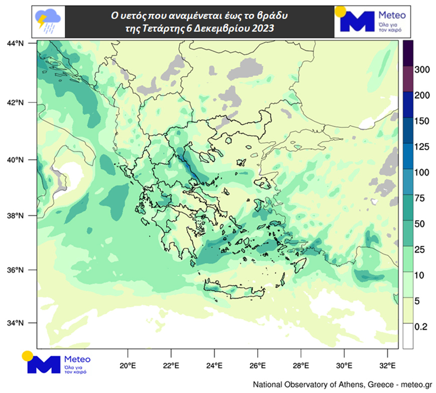 Στον χάρτη που ακολουθεί παρουσιάζεται ο υετός που αναμένεται έως το βράδυ της Τετάρτης 06/12.