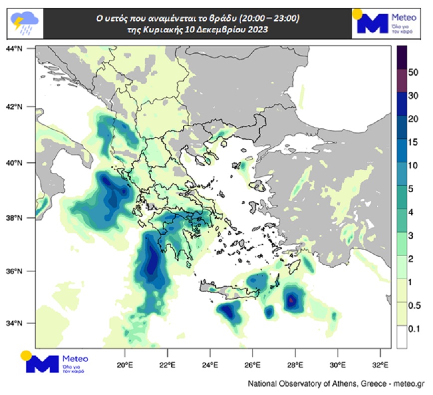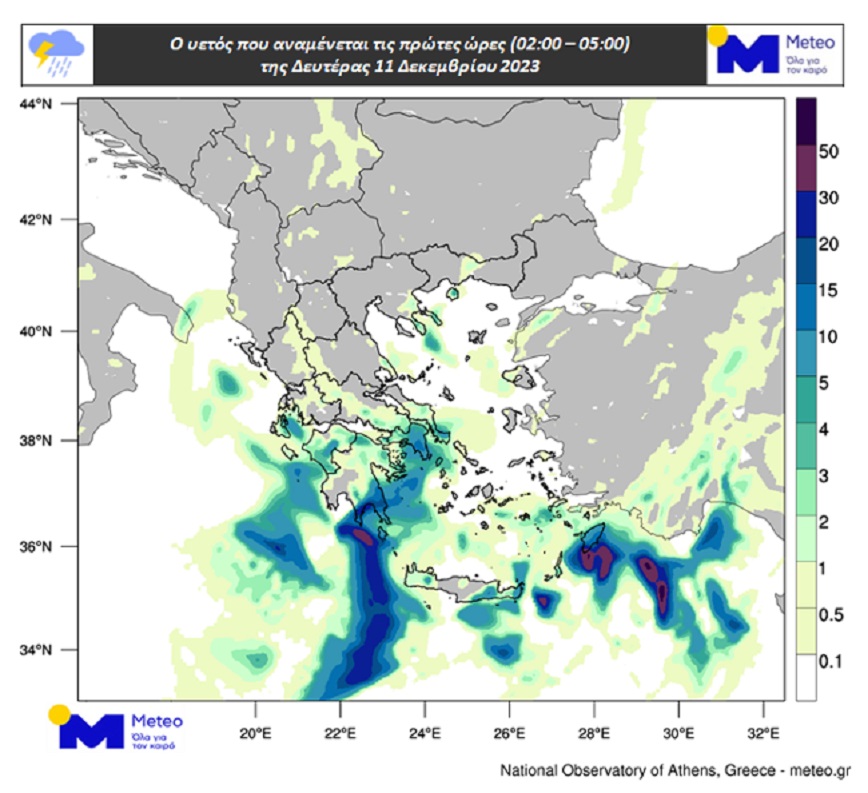Κατά τη διάρκεια της νύχτας χιονοπτώσεις αναμένονται και σε ορεινά της Στερεάς Ελλάδας. Τα φαινόμενα από τις πρώτες πρωινές ώρες της Δευτέρας 11/12 θα περιοριστούν στα νότια και ανατολικά ηπειρωτικά και στο Αιγαίο και έως το απόγευμα θα εξασθενήσουν σημαντικά.