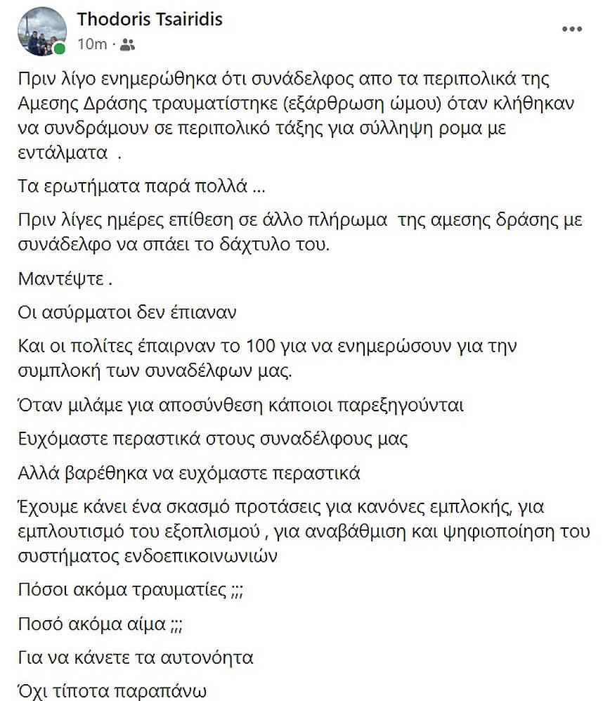 Στο συμβάν, αναφέρθηκε με ανάρτησή του ο πρόεδρος της Ένωσης Αστυνομικών Υπαλλήλων Θεσσαλονίκης, Θόδωρος Τσαϊρίδης, ο οποίος μάλιστα δημοσίευσε φωτογραφία του αστυνομικού που τραυματίστηκε στον ώμο.