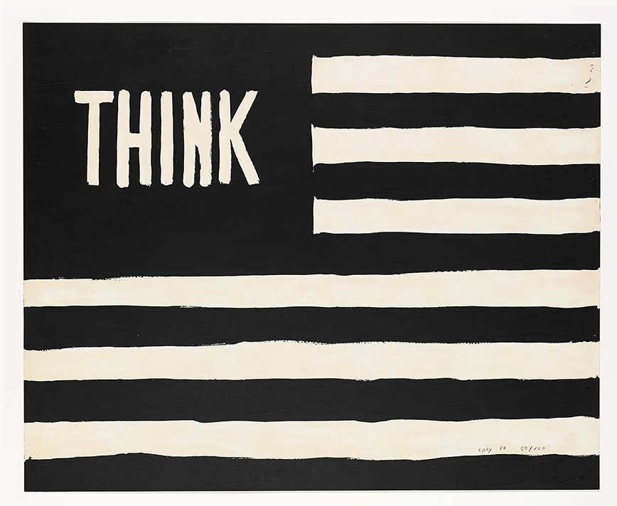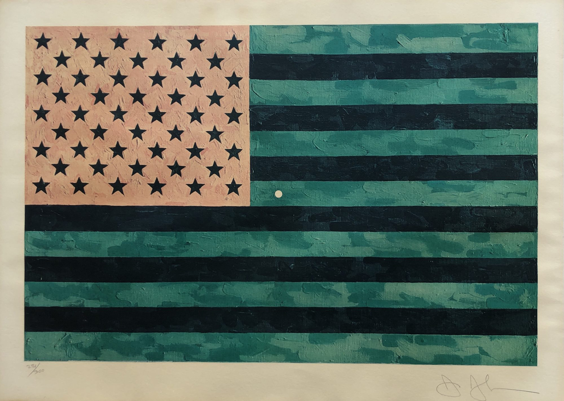 Jasper Johns. Flag. Ο εν λόγω καλλιτέχνης έχει παραποιήσει σε αρκετά έργα του τη σημαία των ΗΠΑ. Ένα από τα πιο εμβληματικά του έργα είναι αυτό του 1969 Flag (Moratorium), μια πρωτότυπη λιθογραφία, που έγινε αναπόσπαστο μέρος του αντιπολεμικού κινήματος για το Βιετνάμ. Το έργο συμβολίζει τη φρίκη του πολέμου έχοντας αλλάξει τα χρώματα της σημαίας σε πράσινο και μαύρο, χρώματα που παραπέμπουν στο στρατιωτικό καμουφλάζ του αμερικανικού στρατού. Στο κέντρο υπάρχει μια μοναδική λευκή τρύπα από σφαίρα.