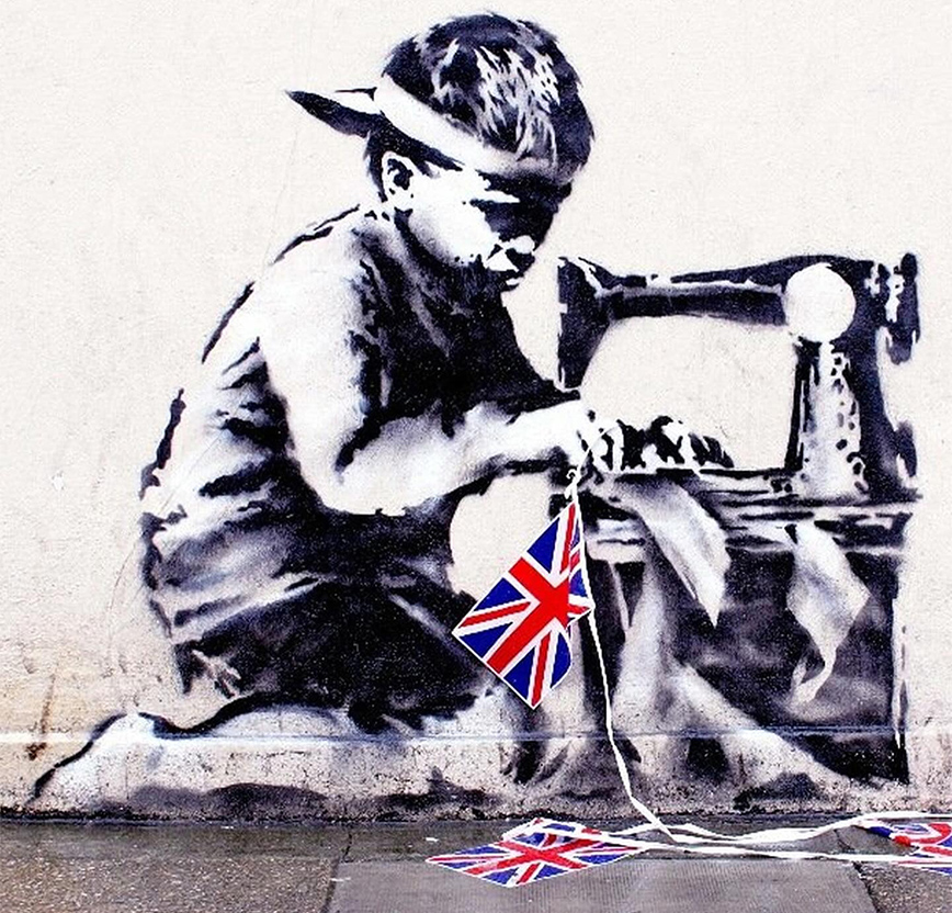 Banksy. Slave Labour 2012. Πρόκειται για μια τοιχογραφία του διάσημου street artist. Το έργο τέχνης απεικονίζει ένα παιδί σε μια ραπτομηχανή που φτιάχνει βρετανικές σημαίες. Το έργο ήταν μια διαμαρτυρία ενάντια στη χρήση sweatshops για την κατασκευή αναμνηστικών για τον εορτασμό του «Διαμαντένιου Ιωβηλαίου» και των Ολυμπιακών Αγώνων του Λονδίνου, το 2012