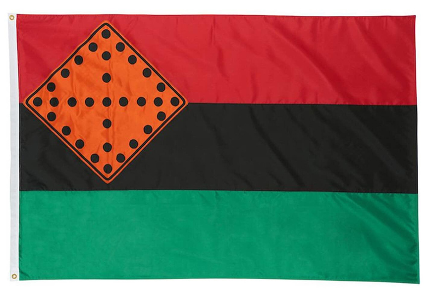 Nari Ward. Breathing Flag 2017. Το έργο εκτίθεται στο Μουσείο του Κουίνς και αναφέρεται στη σημαία του Universal Negro Improvement Association (UNIA) του Marcus Garvey και σε ένα αφρικανικό σύμβολο προσευχής γνωστό ως Κονγκολέζικο Κοσμόγραμμα, το οποίο αντιπροσωπεύει τη γέννηση, τη ζωή, τον θάνατο και την αναγέννηση.