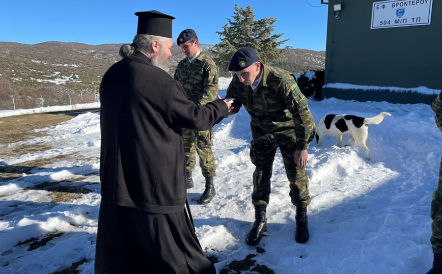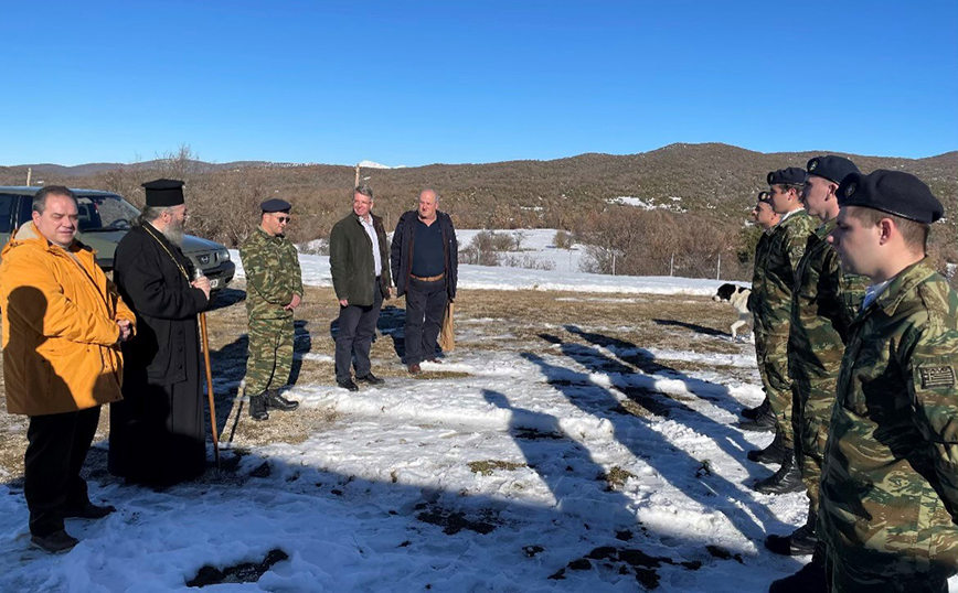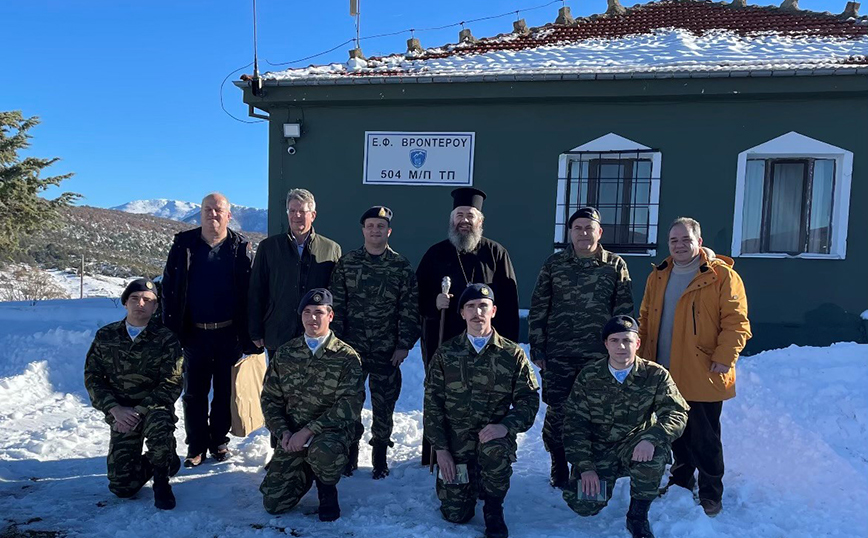Παράλληλα ο Σεβασμιώτατος κ. Ειρηναίος με τον κ. Δήμτσα, συνοδευόμενοι από τον Διοικητή του 1ου Συντάγματος Πεζικού Φλώρινας Συνταγματάρχη (ΠΖ) κ. Στέφανο Δοξάκη, τον Αντιπεριφερειάρχη Περιφερειακής Ενότητας Φλώρινας κ. Σωτήριο Βόσδου, τον Δήμαρχο Πρεσπών κ. Παναγιώτη Πασχαλίδη και τον νεοεκλεγέντα Δήμαρχο Πρεσπών κ. Γεώργιο Στεργίου, επισκέφθηκαν τα στρατιωτικά φυλάκια της Νίκης, του Λαιμού και του Βροντερού, όπου μετέφεραν τις ευχές του Μακαριωτάτου, προσφέροντας στους ακρίτες αξιωματικούς και στρατιώτες την Καινή Διαθήκη.