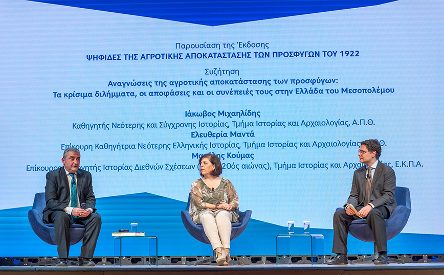 Στη συνέχεια, ο καθηγητής κ. Μιχαηλίδης, η επίκουρη καθηγήτρια στο Τμήμα Νεότερης και Σύγχρονης Ιστορίας και Κοινωνικής Ανθρωπολογίας, Τμήμα Ιστορίας και Αρχαιολογίας του ΑΠΘ κα Ελευθερία Μαντά και ο επίκουρος καθηγητής Ιστορίας Διεθνών Σχέσεων στο Τμήμα Ιστορίας και Αρχαιολογίας του ΕΚΠΑ κ. Μανόλης Κούμας συμμετείχαν σε συζήτηση με θέμα «Αναγνώσεις της αγροτικής αποκατάστασης των προσφύγων: Τα κρίσιμα διλήμματα, οι αποφάσεις και οι συνέπειές τους στην Ελλάδα του Μεσοπολέμου».