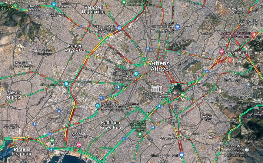 Στο «κόκκινο» είναι η κίνηση με μποτιλιάρισμα χιλιομέτρων στους περισσότερους δρόμους της Αθήνας.