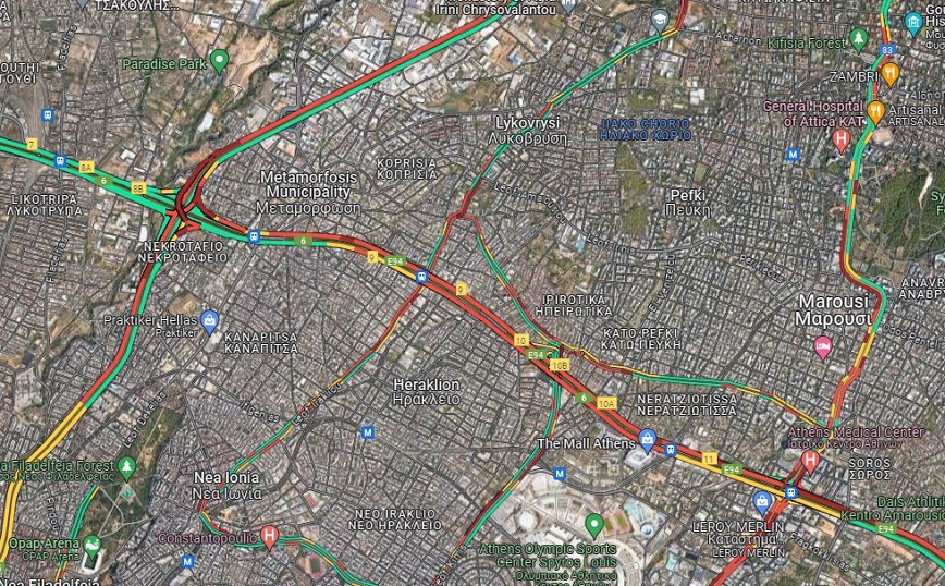 Στην Αττική Οδό παρατηρούνται καθυστερήσεις μέχρι και 30 λεπτών στο ρεύμα προς Ελευσίνα, από τον κόμβο της Πεντέλης έως εκείνον της Μεταμόρφωσης.