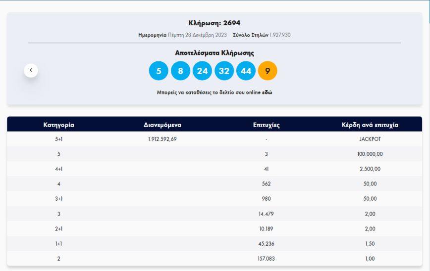 Απόψε Πέμπτη 28 Δεκεμβρίου 2023, στην κλήρωση 2694 του Τζόκερ του ΟΠΑΠ, θα μοιραστούν στους τυχερούς της πρώτης κατηγορίας τουλάχιστον 1.000.000 ευρώ.