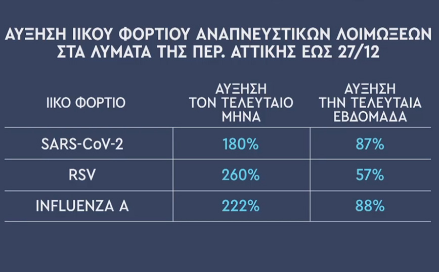 Σημαντική είναι η αύξηση του ιικού φορτίου στα λύματα της Περιφέρειας Αττικής. Ο καθηγητής Αναλυτικής Χημείας Νίκος Θωμαΐδης μίλησε στην ΕΡΤ και δήλωσε ότι «η πραγματικότητα δείχνει ότι τον τελευταίο μήνα είχαμε πολύ μεγάλη αύξηση στο γενικό φορτίο στα λύματα τόσο του κορονοϊού, όσο και άλλων αναπνευστικών ιών όπως η γρίπη τύπου Α και του συγκυτιακού ιού».