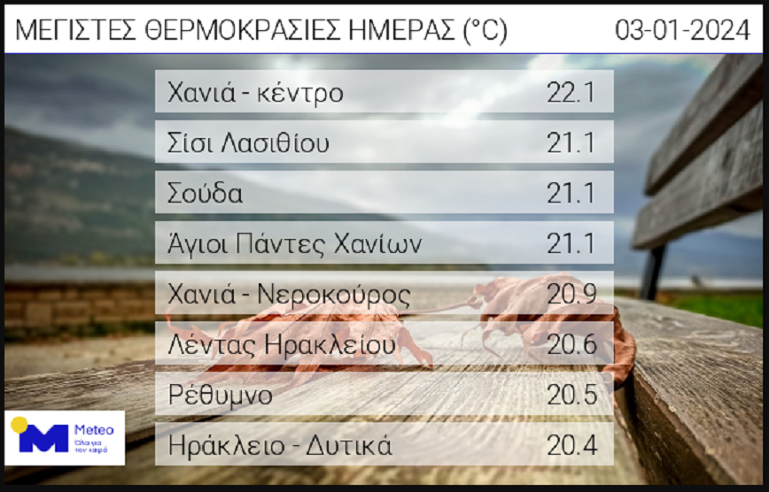 Το meteo.gr του Εθνικού Αστεροσκοπείου συγκέντρωσε τις οκτώ υψηλότερες θερμοκρασίες που καταγράφηκαν την Τετάρτη (3/1) και τις παραθέτει: