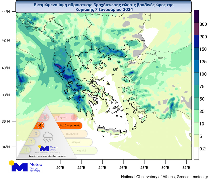 Στον παρακάτω χάρτη παρουσιάζεται το αθροιστικό ύψος βροχής που αναμένεται έως τις βραδινές ώρες της Κυριακής 07/01.