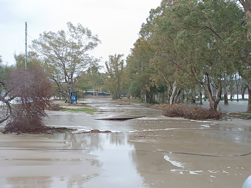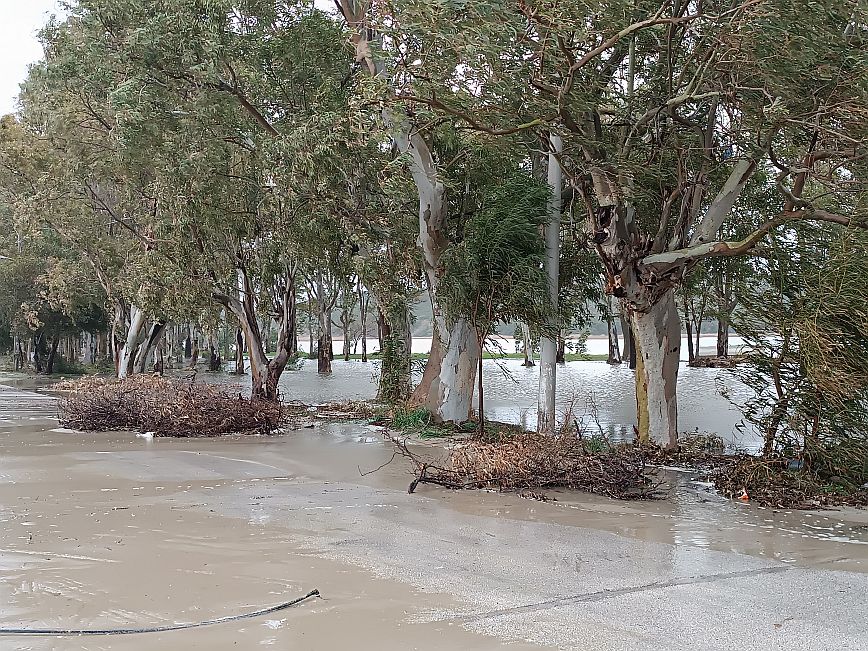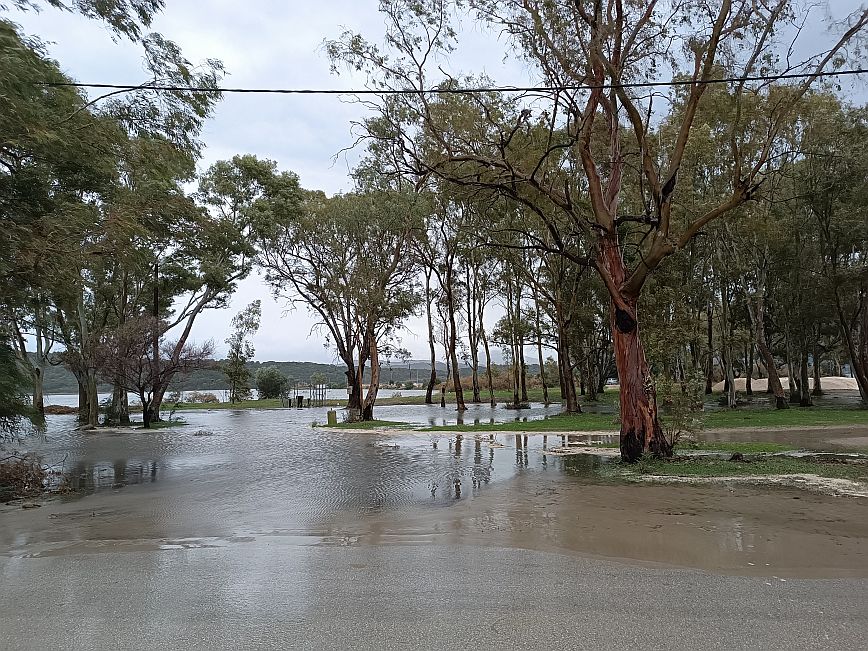 Τα νερά έχουν καλύψει τμήμα του δρόμου από τη νέα έως την παλιά γέφυρα με αποτέλεσμα η διέλευση οχημάτων να είναι αδύνατη.