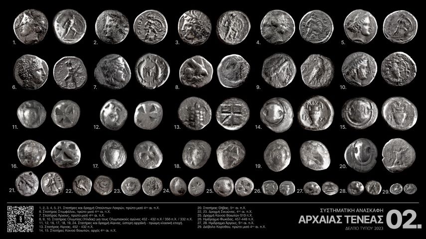 Εξαιρετικής αρχαιολογικής σημασίας και σπανιότητας -συνεχίζει η ανακοίνωση του ΥΠΠΟ- είναι ο θησαυρός 29 αργυρών αρχαίων ελληνικών νομισμάτων που εντοπίστηκε μαζί με φορητό πήλινο βωμό, μικρογραφικό αγγείο και ειδώλιο ίππου με αναβάτη. Ο θησαυρός περιλαμβάνει νομίσματα που χρονολογούνται από τον ύστερο 6ο αι. π.Χ. μέχρι και τη δεκαετία του 330 π.Χ., πολλά εξ αυτών από τα σπανιότερα και πλέον ιστορικά νομίσματα της αρχαίας Ελλάδας, όπως τρεις στατήρες Ήλιδος που κόπηκαν στην Ολυμπία κατά τη διάρκεια διαφορετικών Ολυμπιακών Αγώνων, στατήρας της Αίγινας με χερσαία αντί για θαλάσσια χελώνα, στατήρες Στύμφαλου, ‘Αργους και Οπουντίων Λοκρών, καθώς και στατήρας Θήβας του 5ου αι. π. Χ. που απεικονίζει τον Ηρακλή να πνίγει με τα χέρια του δύο φίδια. Η παρουσία του εν λόγω θησαυρού συνδέεται με τα ευρήματα λατρευτικής χρήσης (γυναικεία και ζωόμορφα ειδώλια, μικρογραφικά αγγεία και άλλα) που είχαν εντοπιστεί πέρυσι και συνέχισαν να εντοπίζονται και φέτος προσδίδοντας ξεκάθαρα τελετουργικό χαρακτήρα στους χώρους που αποκαλύπτονται.