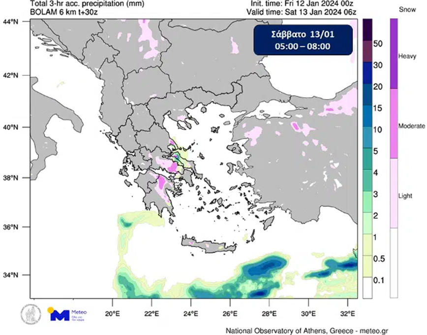 Στη Θεσσαλία, τις Σποράδες, την Εύβοια, την κεντρική και ανατολική Στερεά (συμπεριλαμβανομένης της Αττικής), την ανατολική Πελοπόννησο, τις Κυκλάδες και την Κρήτη, και τις πρώτες πρωινές ώρες στη Χαλκιδική, την ανατολική Μακεδονία και τα νησιά του βορειοανατολικού Αιγαίου, νεφώσεις με τοπικές βροχές και στις βορειότερες περιοχές χιονόνερο. Χιονοπτώσεις θα σημειωθούν κατά τόπους στα ορεινά καθώς και σε ημιορεινές περιοχές των ανωτέρω περιοχών (ενδεικτικό υψόμετρο από τα 500-600 μέτρα και πάνω). Βαθμιαία εξασθένηση των φαινομένων από το βράδυ και από τα βόρεια.