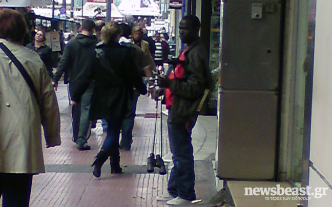 Και ελάχιστοι, όπως αυτός που βλέπετε στη φωτογραφία, βρίσκονται στην Ομόνοια για να «διαφημίσουν» κυάλια, γυαλιά ηλίου και απομίμηση ρολόγια.