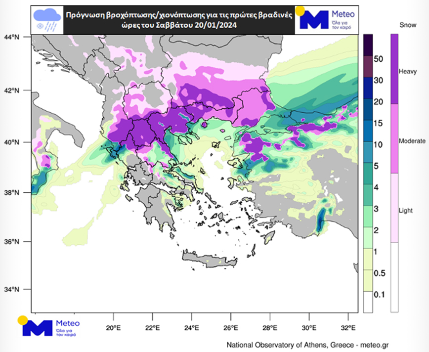 Από το βράδυ του Σαββάτου και μέχρι περίπου τις 2 τα ξημερώματα οι χιονοπτώσεις θα φτάσουν σε περιοχές της βόρειας Στερεάς και της βόρειας Πελοποννήσου.