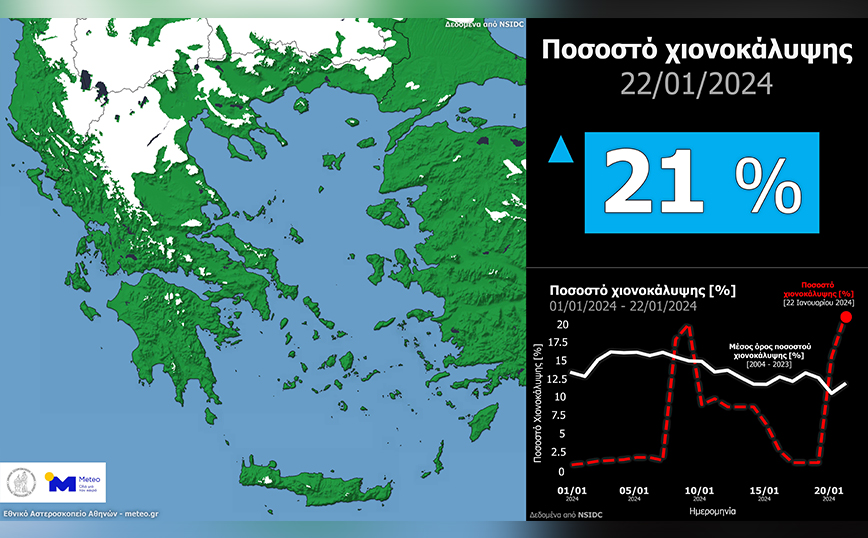 Περίπου το 21% της χερσαίας έκτασης της Ελλάδας καλύφθηκε στις 22 Ιανουαρίου με χιόνι, σύμφωνα με τα νεότερα δορυφορικά δεδομένα για τη χιονοκάλυψη στη χώρα μας, και το ποσοστό αυτό αποτελεί την τέταρτη πιο εκτεταμένη χιονοκάλυψη για αυτή την περίοδο του έτους, από το 2005.