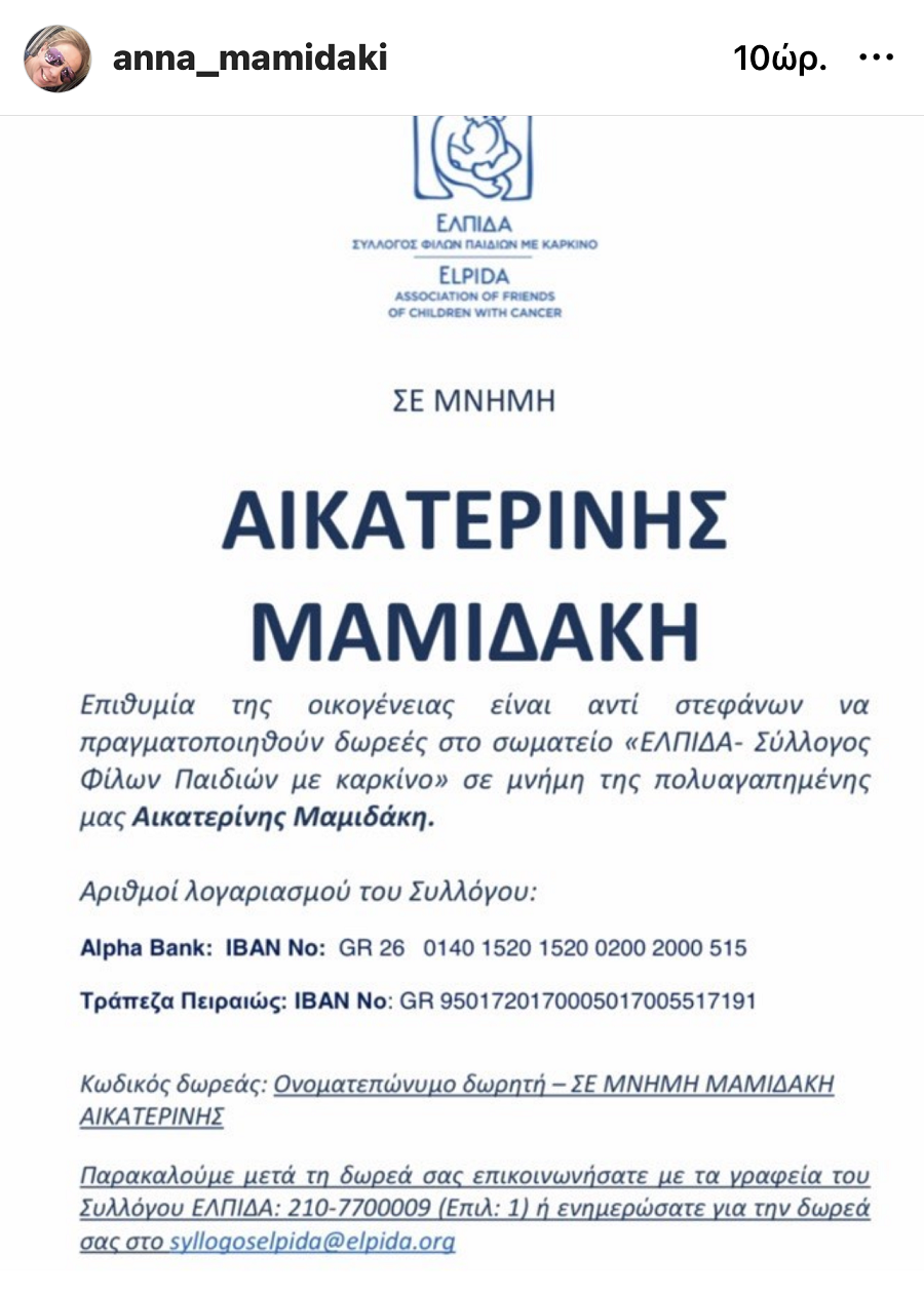 Η Άννα Μαμιδάκη σε μια σεμνή ανάρτηση της αναφέρει πως αντί στεφάνων θα προτιμούσε να γίνουν δωρεές στο Σωματείο «Ελπίδα» το οποίο όσο η ίδια όσο και η μητέρα της έχουν υπηρετήσει εδώ και χρόνια. «Για τη μνήμη της λατρεμένης μου μητέρας» αναφέρει η επιχειρηματίας στην ανάρτηση της.